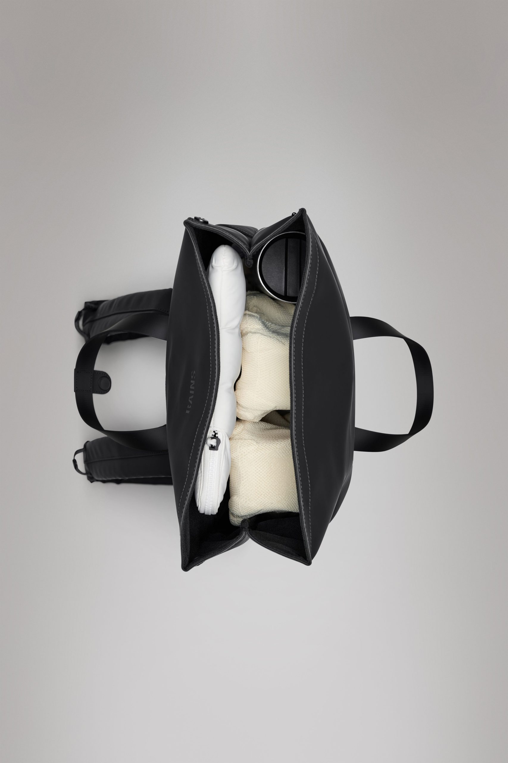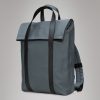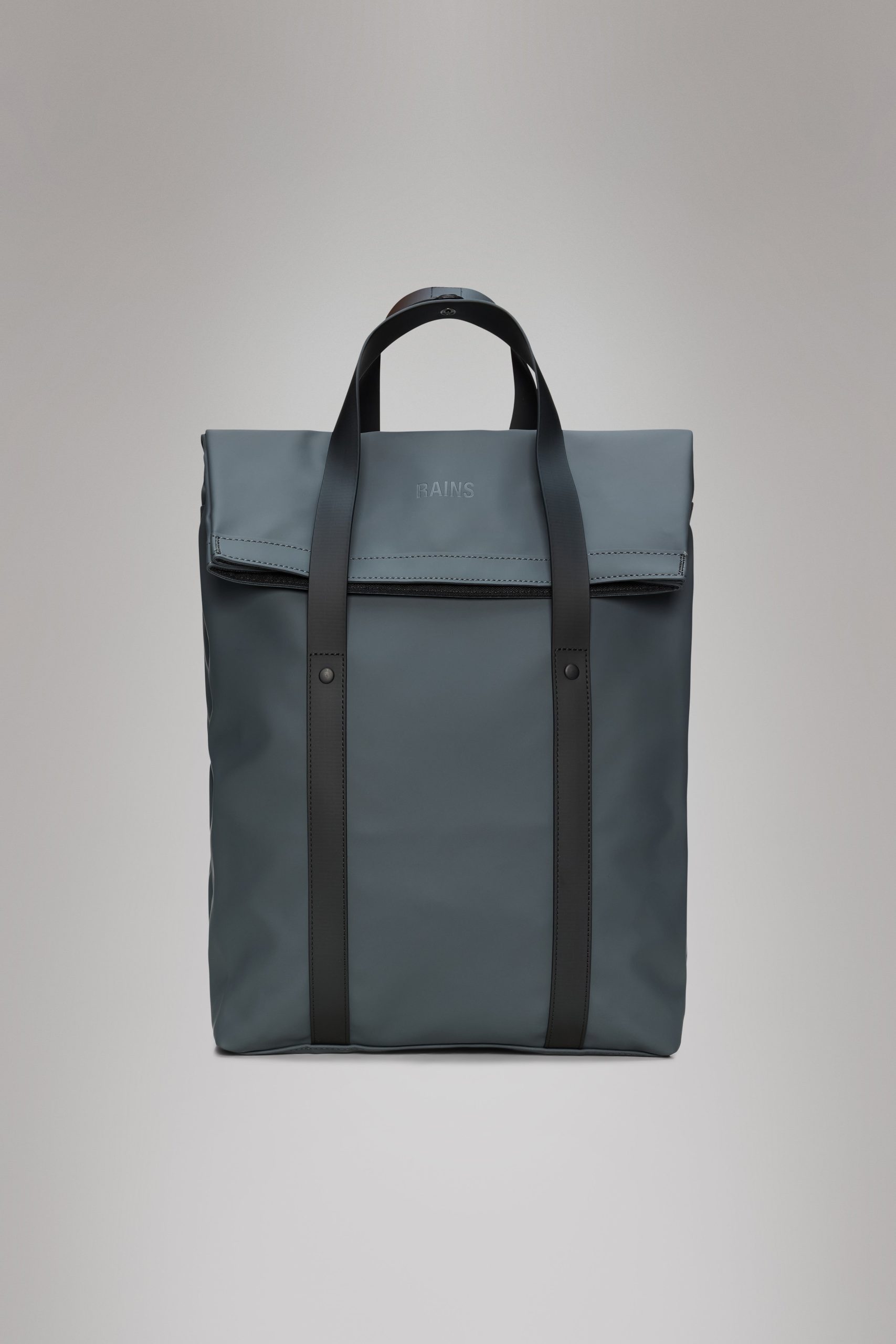 2 Way Tote Backpack is a clean, commuter-friendly design with tote function. 2 Way Tote Backpack is characterized by a fold-top opening and signature TPU strap details with top handles. The fold-top opening gives full access to a spacious main compartment with multiple slip and zip pockets and a padded pocket that fits a 16” laptop. On the backside you find a pocket with quick entry for smaller essentials like keys and phone.Wear the 2 Way Tote Backpack as a traditional backpack by adjusting the padded shoulder straps, or as a tote bag using the top handles. Snap attachments on the straps catch excess length of the straps when worn as a tote. 2 Way Tote Backpack is cut from Rains’ signature PU fabric, engineered for carrying strength, durability and a smooth feel.