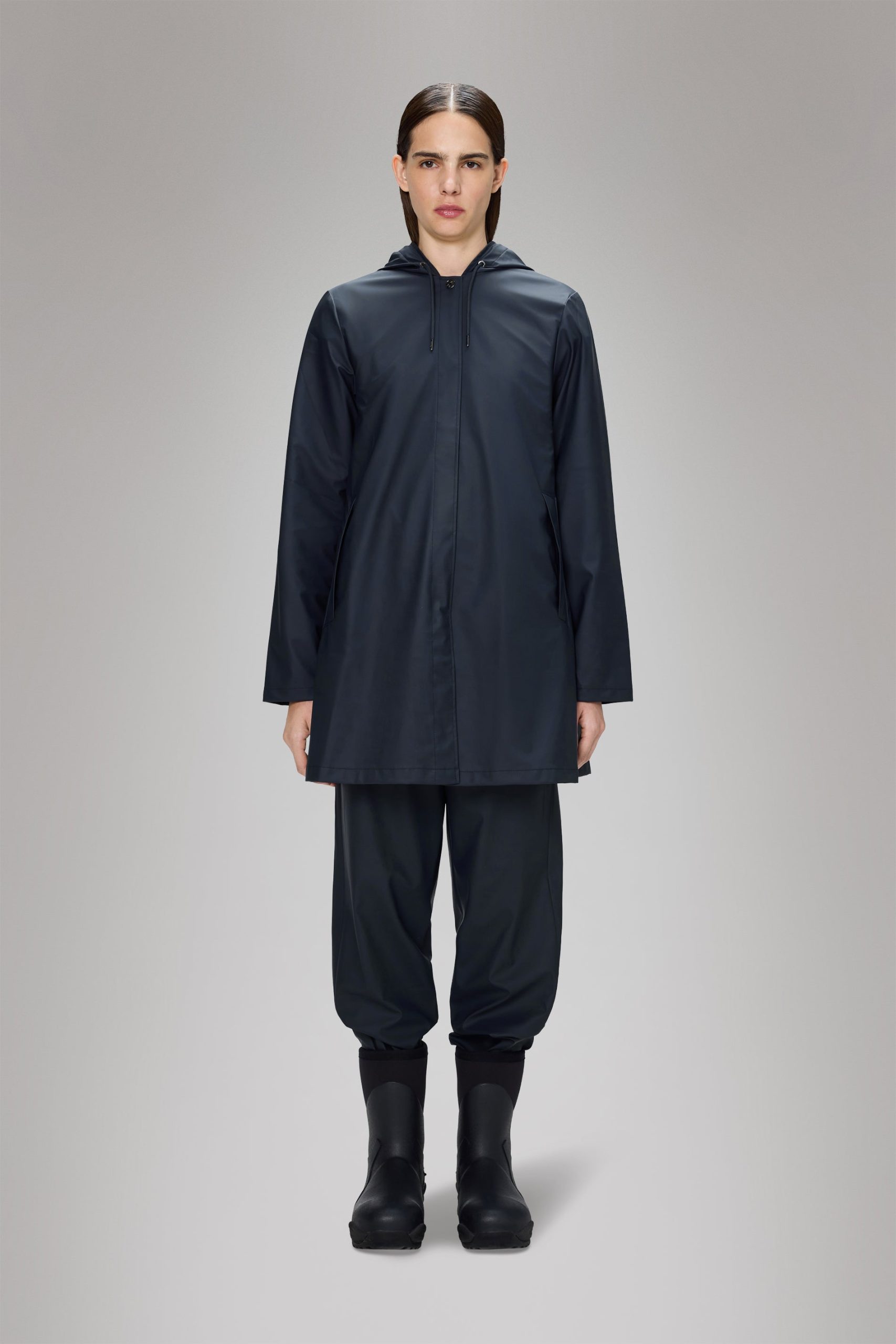 A-Line Jacket is a women’s raincoat characterized by its A-shaped silhouette in an elegant design.A-line Jacket gradually builds in volume from chest to hem with a soft, lightweight feel and elegant drape. It features a drawstring hood with built-in cap, two side pockets and snap adjustable cuffs. This rain coat is completed and closed with hidden snap buttons and a front placket. Under-arm eyelets ensure ventilation for breathable comfort. A-Line Jacket is cut from Rains’ signature PU fabric and features welded seams, making the jacket both resistant to water and wind. The finish is lightweight with a smooth feel.