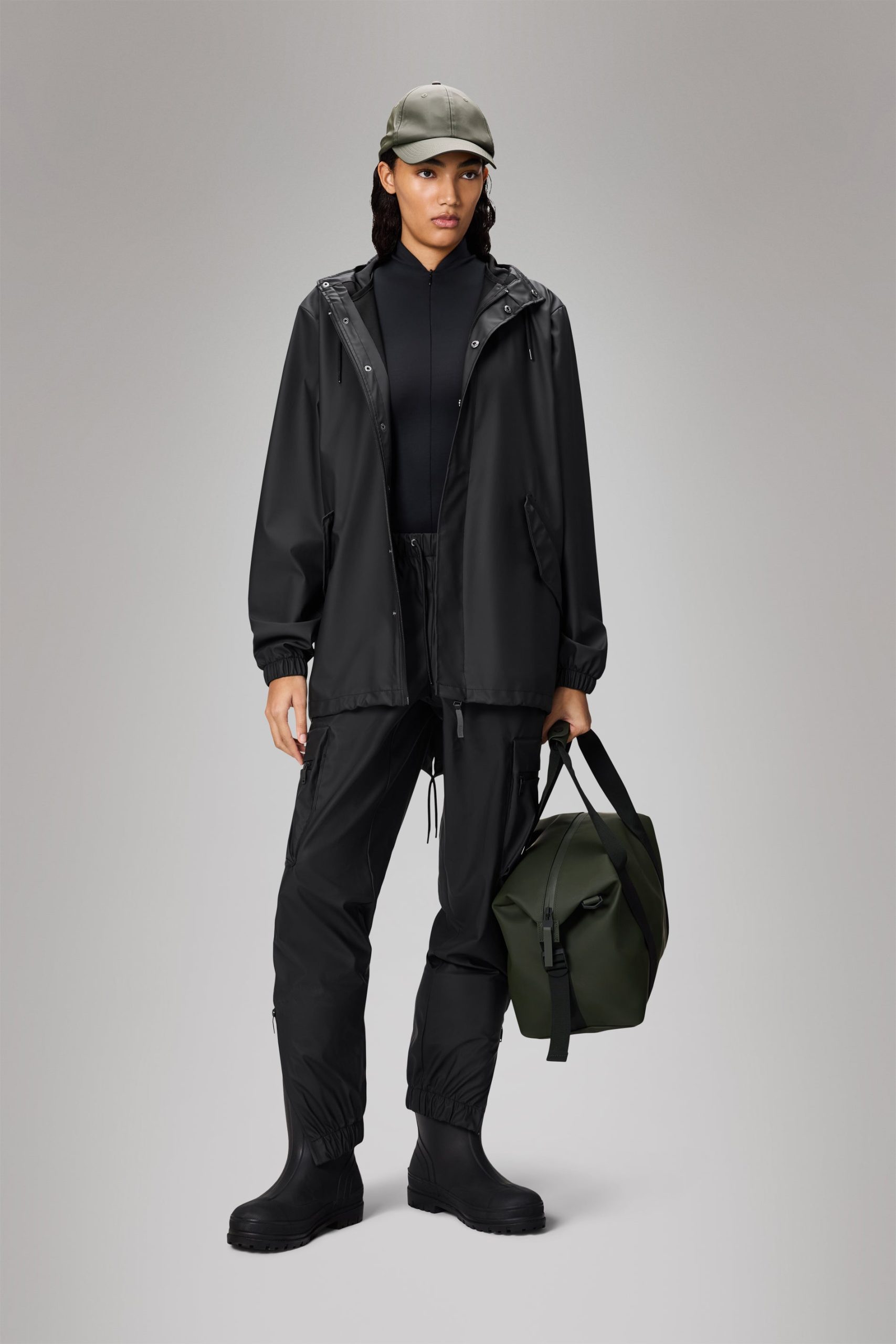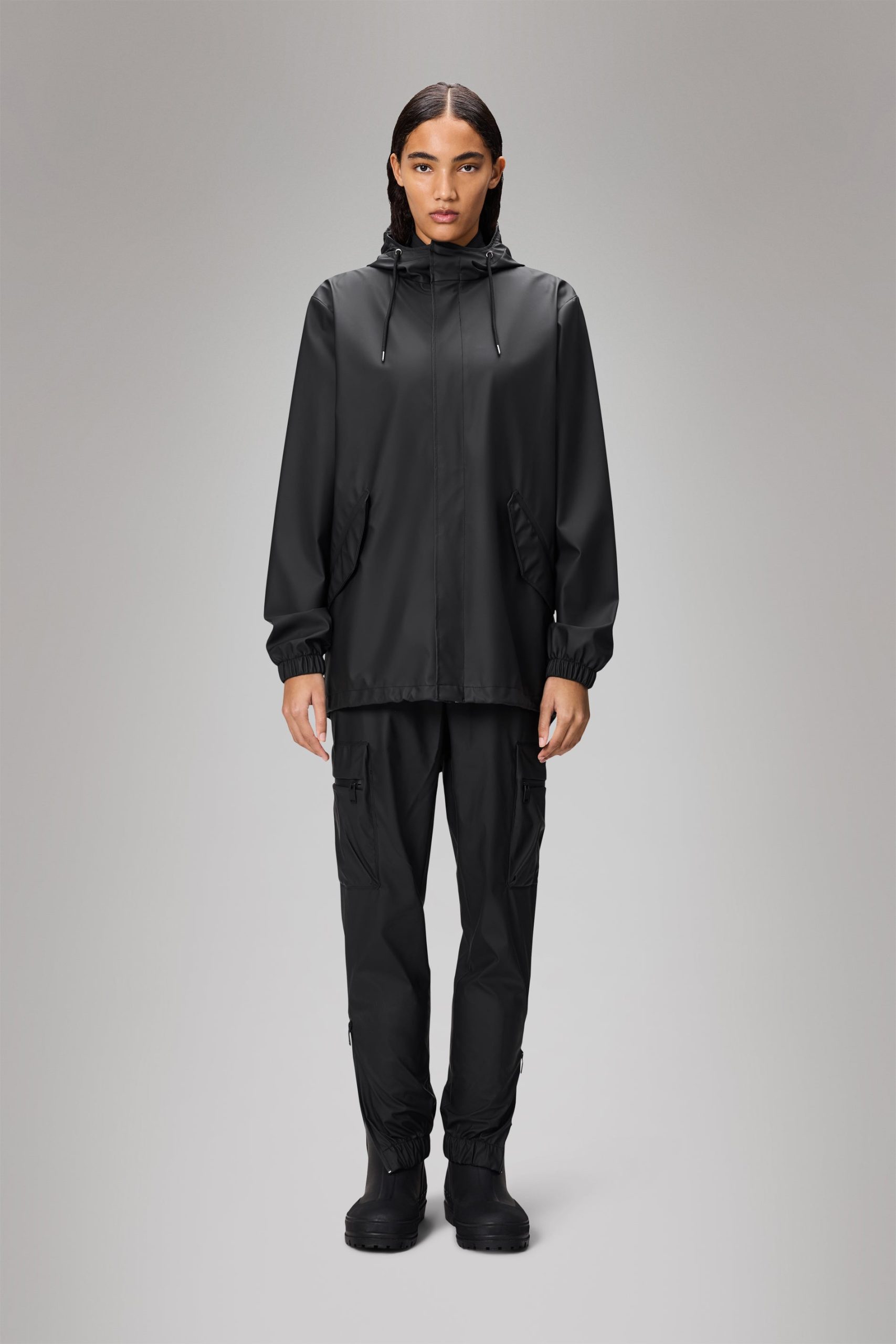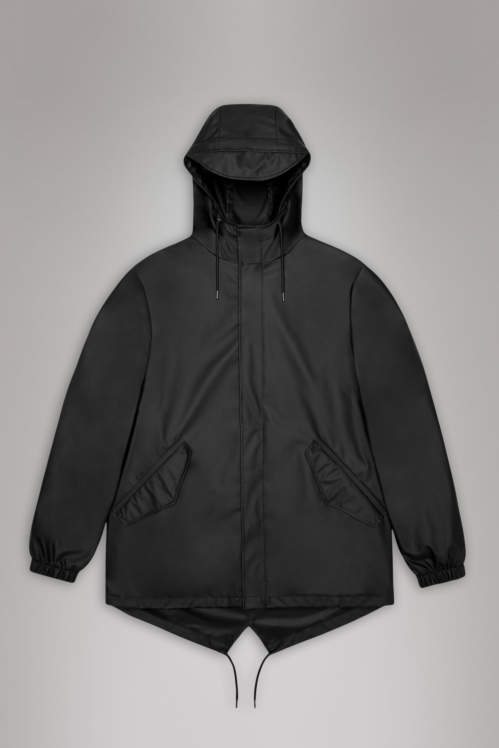 Fishtail Jacket is a unisex raincoat. Characterized by its pared-back aesthetic and drawstring fishtail hem.This design features utility-inspired pockets, vented back yoke and a hood with built-in cap and drawstring. Style is finished with elasticated cuffs for a tighter fit around wrist.Fishtail Jacket has a casual fit with an elegant drape, making it a clear cut raincoat for daily commutes. The coated zip closure is concealed by a placket with snap fastenings. This rain jacket is cut from Rains’ signature PU fabric and features welded seams. The finish is lightweight with a soft feel.