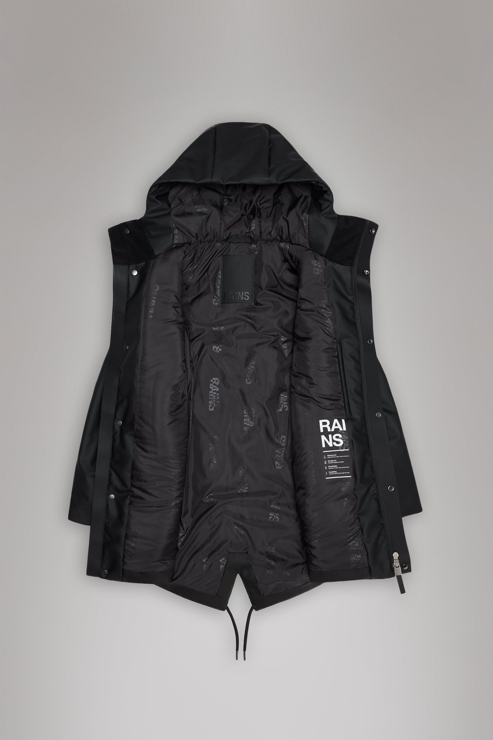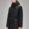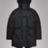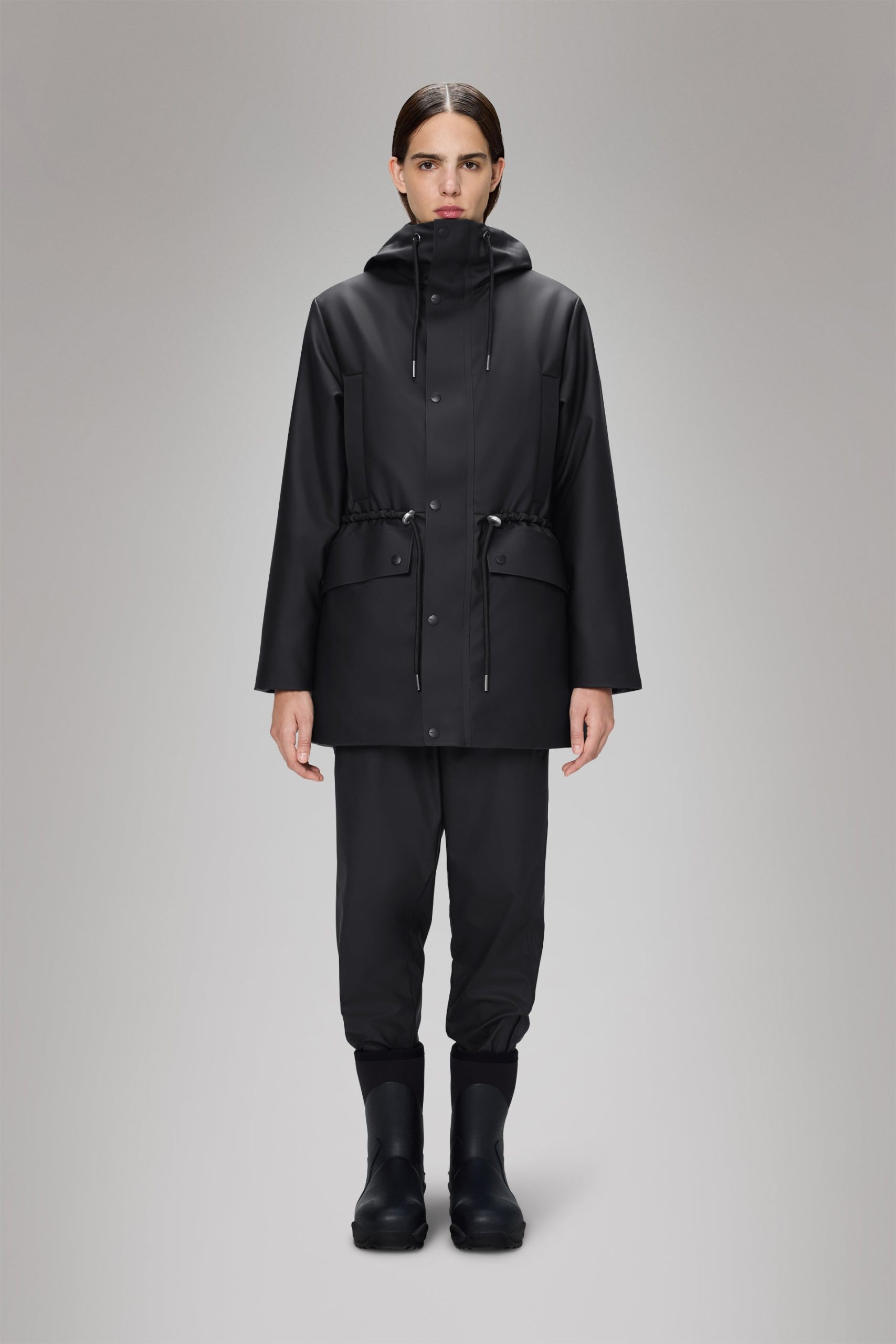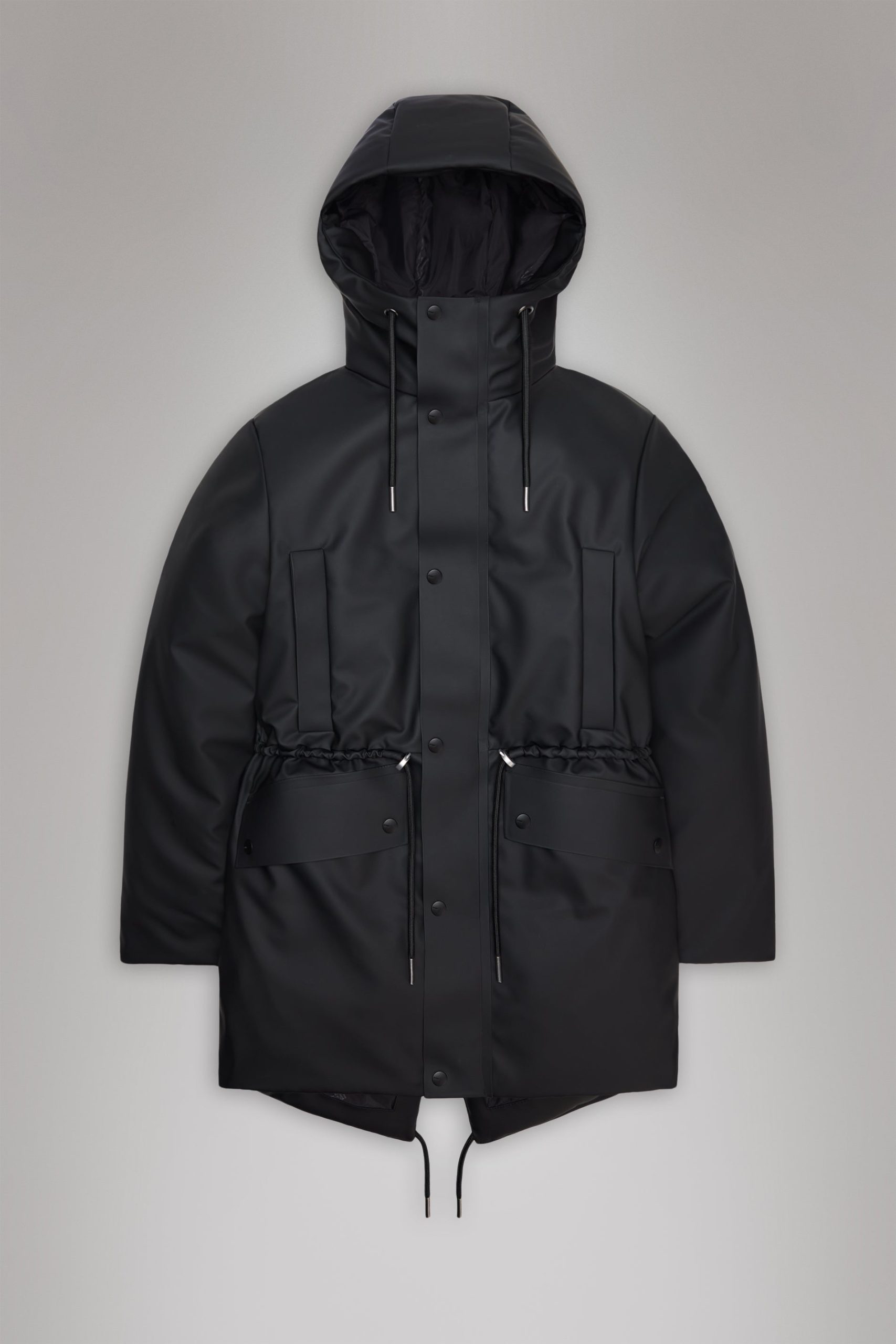 Nome String W Parka is a transeasonal piece with an urban aesthetic. This jacket delivers an easy-to-wear feel with string adjustment at the waistThis parka style features het pressed welt chest pockets, welt pockets below heat pressed pocket flaps and an inside zip pocket in tonal hardware. The silhouette is topped by an insulated hood with chunky tie cords. The Nome collection fills the gap between light and heavy thermal jackets. This parka has flat padded insulation creating your go-to jacket for city commutes in between seasons. The waterproof jacket is cut from Rains’ signature PU fabric with a strong and durable woven backside. The finish is clean with a sharpened look and a smooth feel.