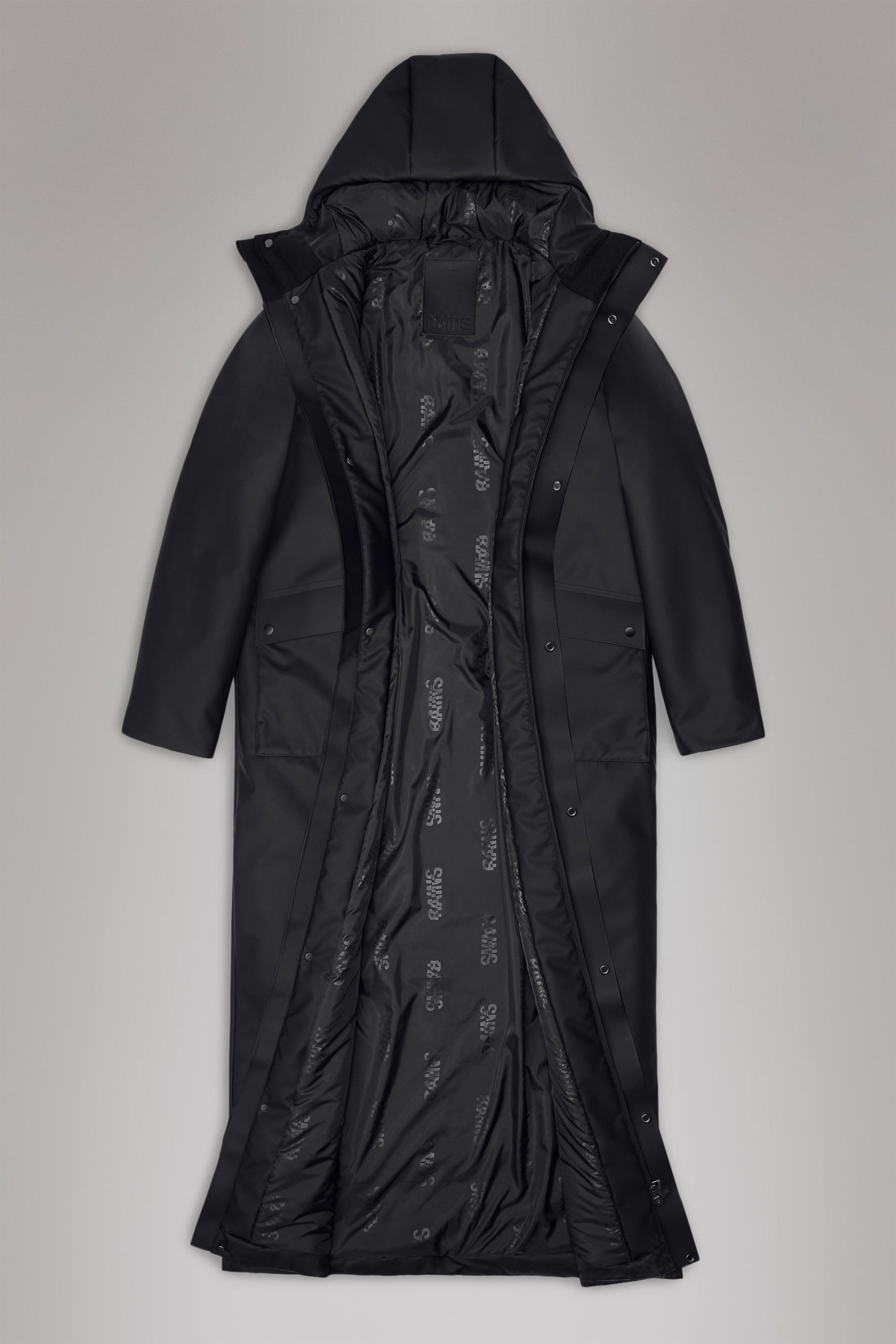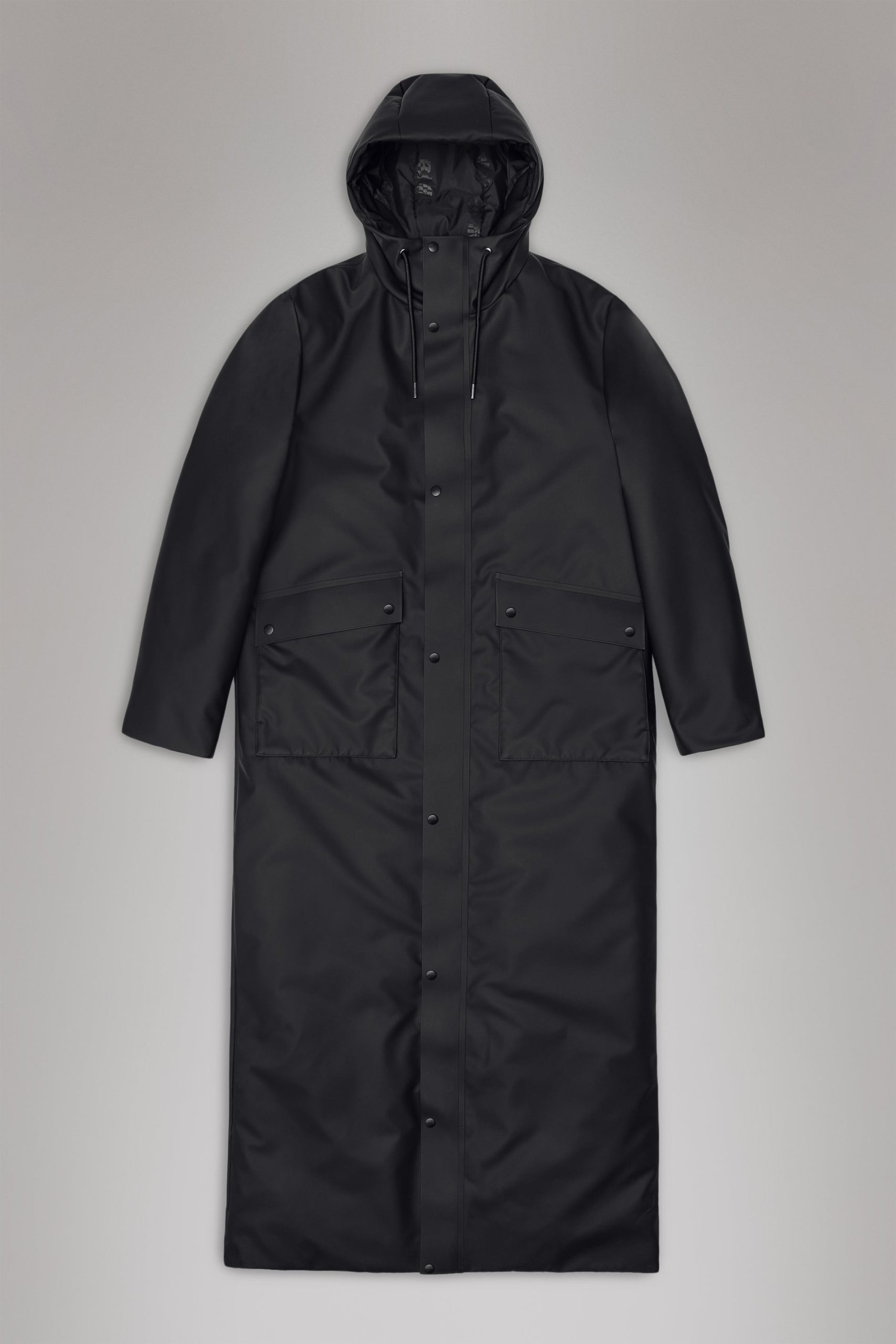 Shown exclusively for FOREVER, our AW25 runway. Where the timeless balances with the extreme.The Nome Vision Longest Jacket is an insulated piece with an urban aesthetic. It delivers a sophisticated, easy-to-wear feel in an extra-long fit—with shoulder pads for an extra dramatic, oversized silhouette.This style features welded seams, concealed rib storm cuffs, cargo pockets with side entrance and heat pressed pocket flaps, an inside zip pocket in tonal hardware, and metal trim details. The silhouette is topped by an insulated hood with chunky tie cords. The Nome collection fills the gap between light and super heavy thermal jackets. This jacket has a long fit with flat padded insulation creating your go-to jacket for winter commutes across the city.The waterproof jacket is cut from Rains’ signature PU fabric with a strong and durable woven backside. The finish is clean with a sharpened look and a smooth feel.