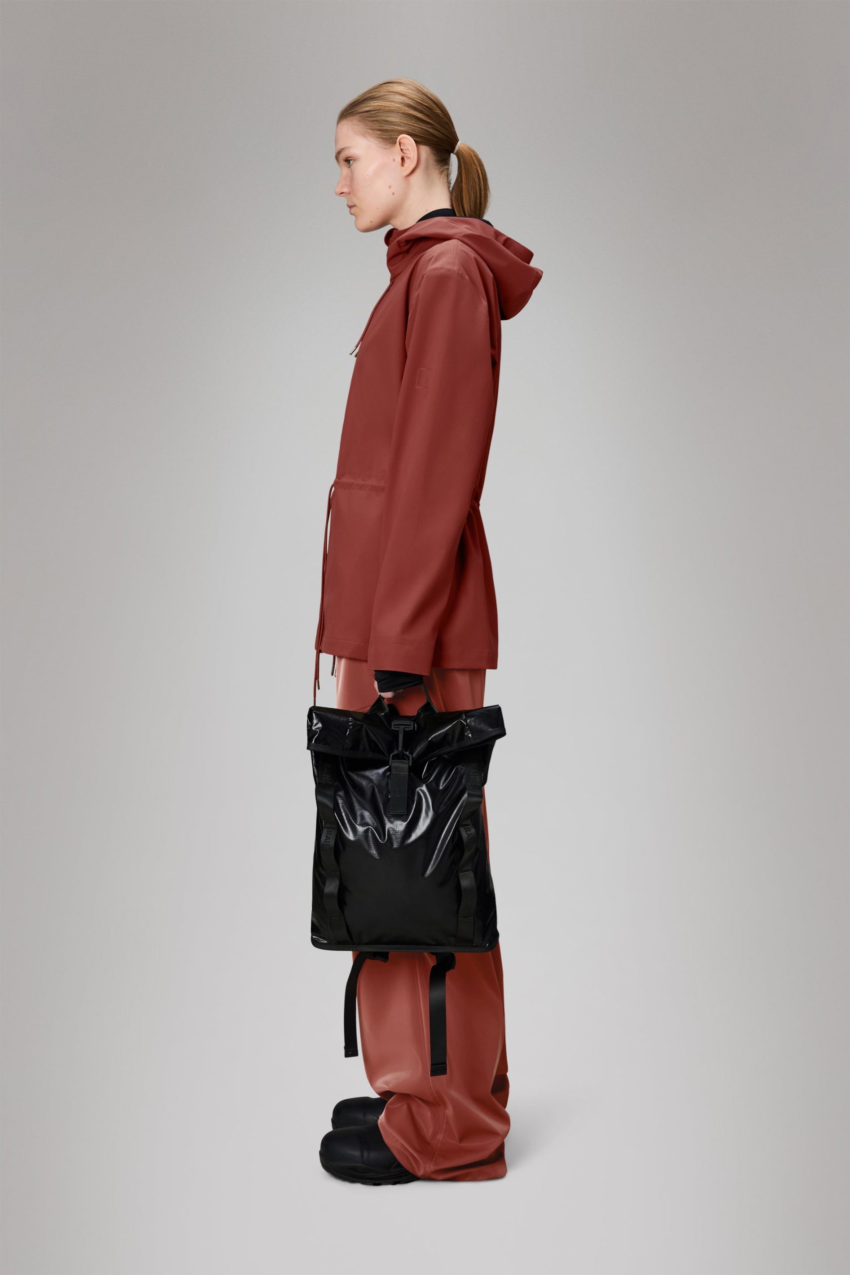 Sibu Rolltop Rucksack Mini is a dependable companion for daily commutes. It’s cut from technical polyester and coated for all-weather protection.Sibu Rolltop Rucksack Mini is designed with intention, keeping its weight low and practicality high. This mini rucksack revises its full-sized counterpart with compact proportions characterized by a convenient rolltop opening. To protect essentials from rain, fold the rolltop into a tight scroll and secure using the signature carabiner. Open to reveal a single main compartment with a smaller mesh pocket for loose essentials. A zipped laptop compartment at the back keeps tech safe on daily commutes in all weathers.Externally, the design is fitted with a discreet front slip pocket, logo-jacquard webbing trims and adjustable compression shoulder straps.Sibu Rolltop Rucksack Mini is cut from Rains’ technical polyester finished with a waterproof TPU coating. The design is sleek and lightweight with a great durability.