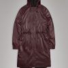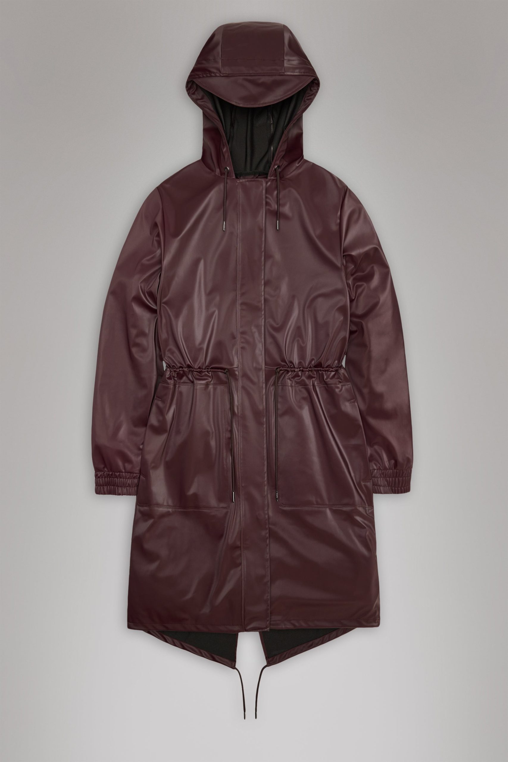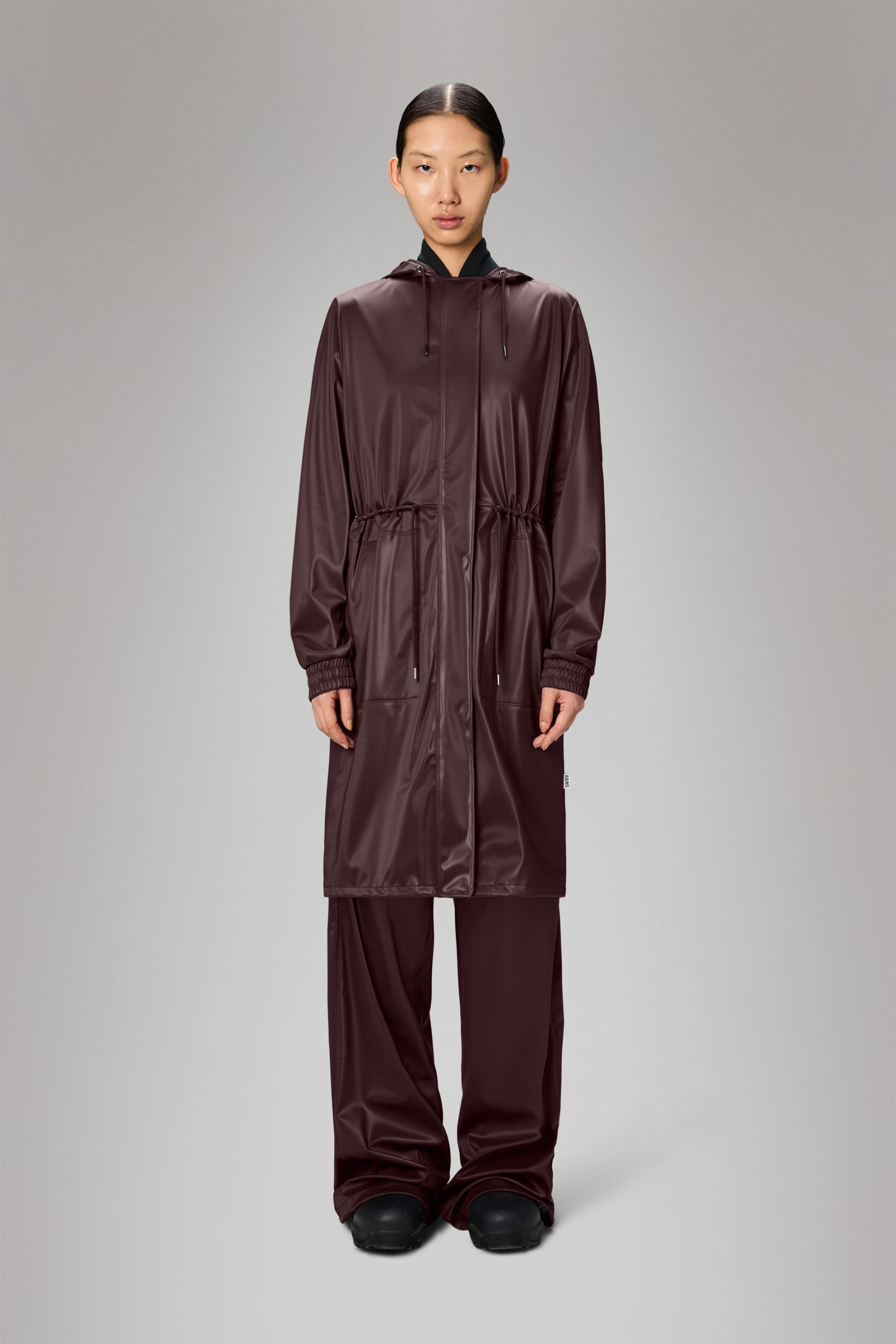 String W Parka takes cues from the iconic fishtail parka. Characterized by a luxe-sport aesthetic and drawstring fishtail hem in parka-length.String W Parka features a drawstring hood with built-in cap and coated zip closure. Under-arm eyelets and a back yoke with concealed vents ensures breathable comfort. The design is finished with minimal side-access pockets and a drawstring waist accentuated by a slim-line external cord tunnel. String W Parka is cut from Rains’ signature PU fabric and features welded seams. The finish is lightweight with a soft feel and elegant drape.