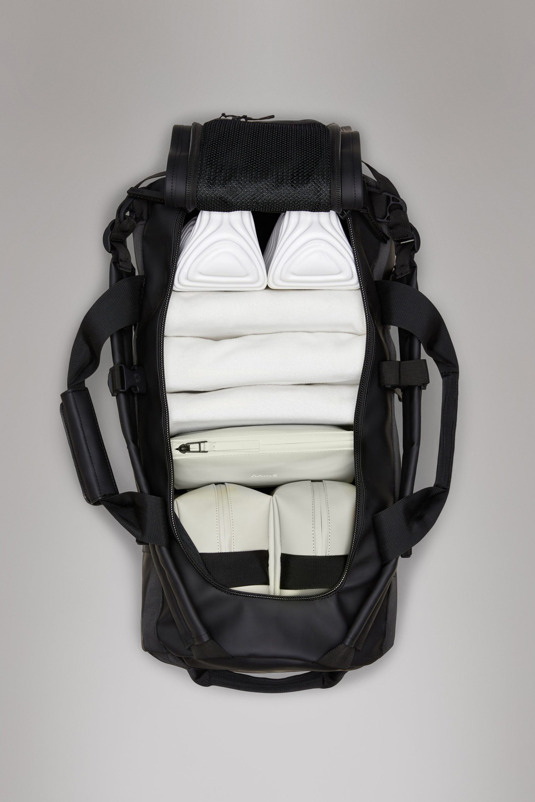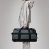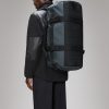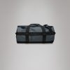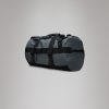 Texel Duffel Bag is a waterproof, high-function travel bag designed for traveling in any weather. The Texel Duffel Bag is characterized by its tubular shape, large zip-opening for easy packing and wrap-around webbing straps. Unzipping the main U-shaped flap reveals a large main compartment with a side mesh pocket. The flap’s underside is also equipped with two zipped mesh pockets. Texel Duffel Bag features a concealed side pocket for passports, keys and other small essentials, a reinforced base for durability and stability, and side-mounted compression straps, helping to keep contents in place. The Duffel can be carried in various ways via durable handle straps and adjustable padded backstraps — both by foot and bike.Texel Duffel Bag is cut in Rains’ signature waterproof PU fabric, engineered for carrying strength, durability, and a smooth feel.