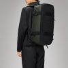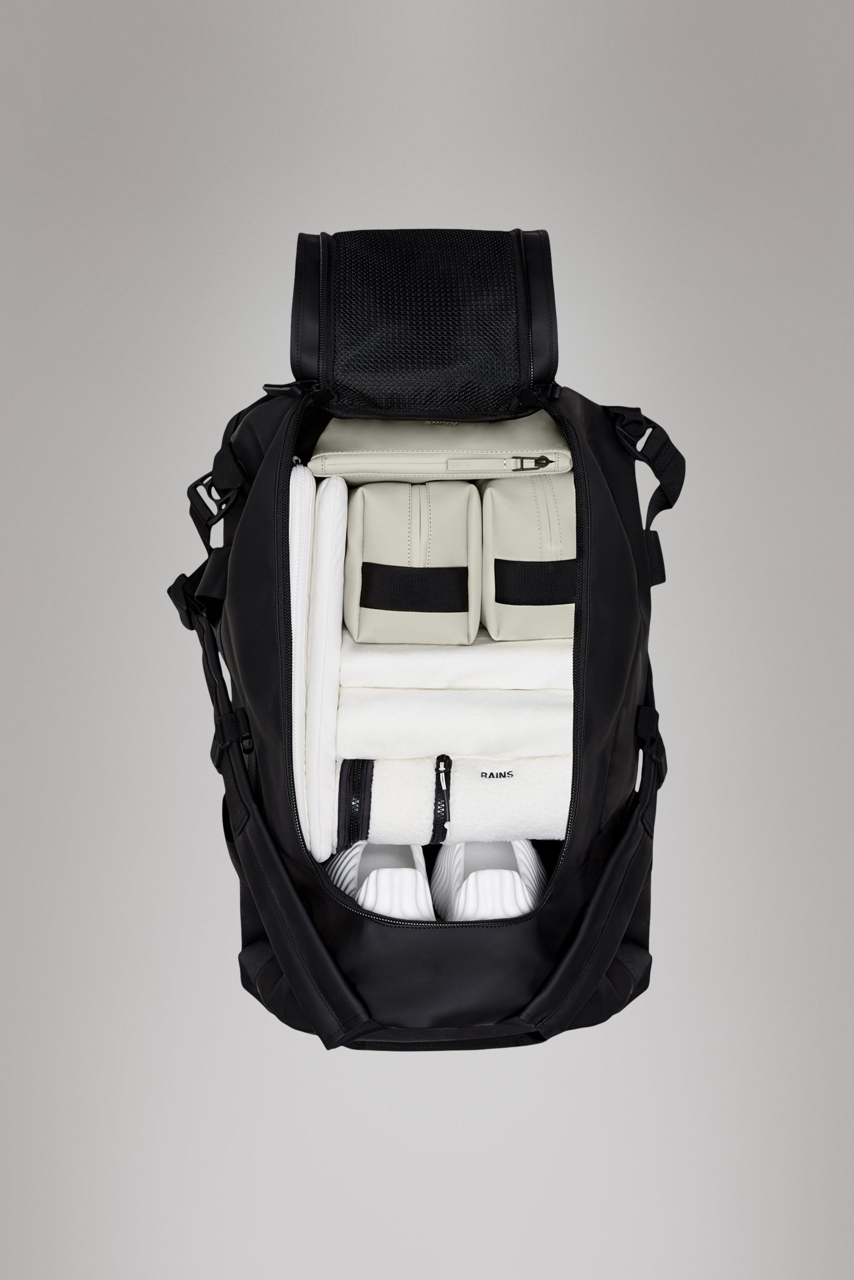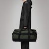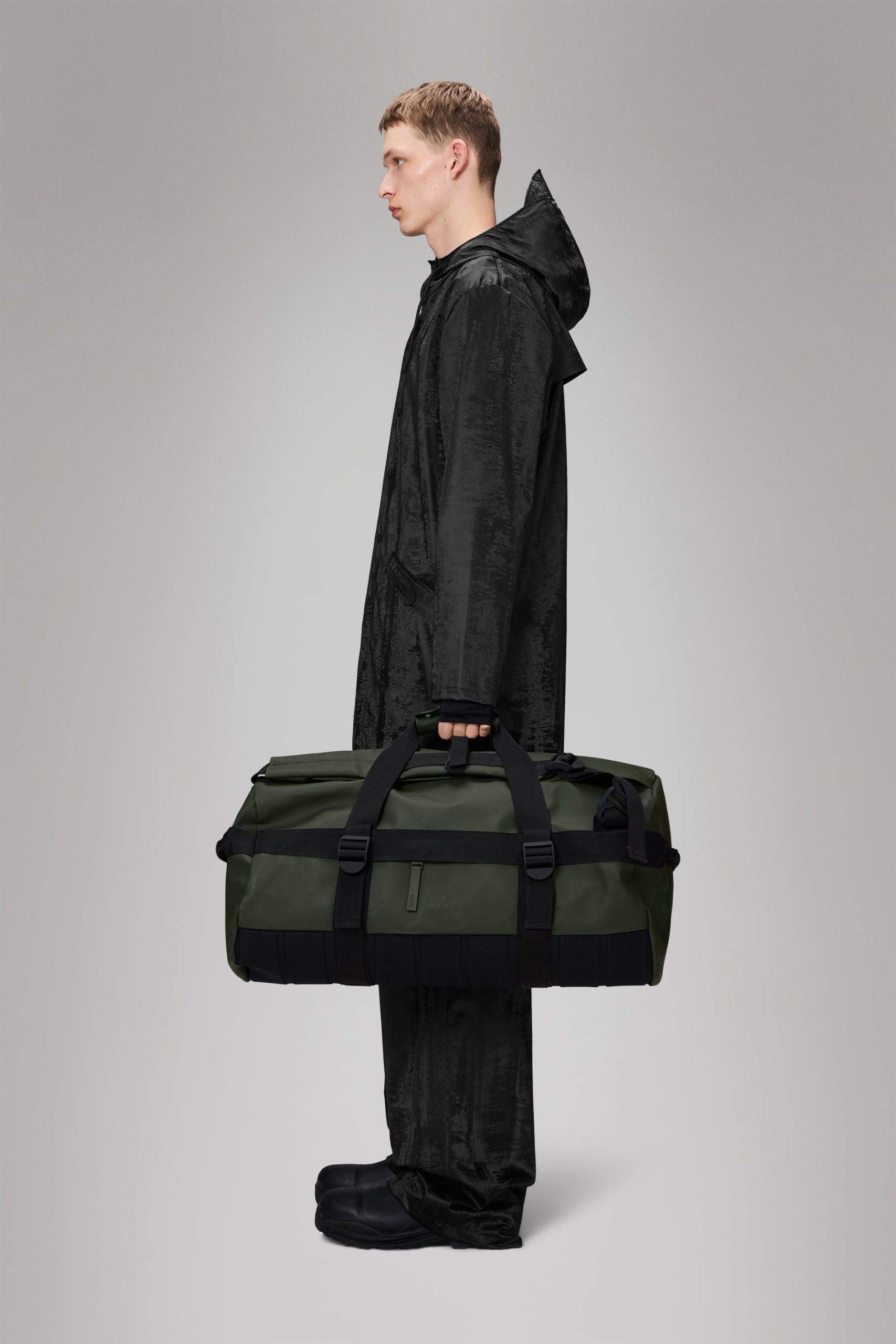 Texel Duffel Bag Small is a high-function silhouette designed for commutes and traveling in any weather. The Texel Duffel Bag Small is characterized by its tubular shape, large zip-opening for easy packing and wrap-around webbing straps. Unzipping the U-shaped flap reveals a large main compartment with a side mesh pocket. The flap’s underside is also equipped with two zipped mesh pockets. Texel Duffel Bag Small features a concealed side pocket for passports, keys and other small essentials, a reinforced base for durability and stability, and side-mounted compression straps, helping to keep contents in place. The duffel can be carried in various ways via durable handle straps and adjustable padded backstraps — both by foot and bike.Texel Duffel Bag Small is cut from Rains’ signature waterproof PU fabric, engineered for carrying strength, durability, and a smooth feel.
