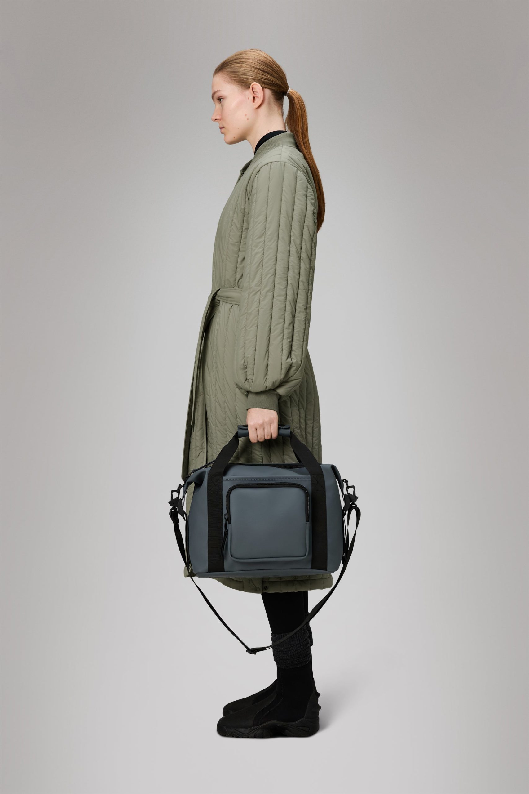 Texel Kit Bag is a compact utility bag designed to hold essentials for short trips. Design is cut from waterproof PU fabric, designed to repel rain.Texel Kit Bag is a waterproof design characterized by its multiple storage options. The main compartment holds mesh and zip pockets and a padded divide for easy organization. The bag has a utility feel, underlined by its strap details and front pocket, ideal for keys, airpods and smaller essentials. Design is finished with a detachable shoulder strap and side compression straps, keeping belongings in place. A back-mounted trolley sleeve, with zip pocket, allows the bag to be slid onto telescopic trolley handles for easy transportation.* Texel Kit Bag is cut from Rains’ signature waterproof PU fabric, engineered for carrying strength, durability, and a smooth feel.*Sized to fit Texel Cabin Trolley and Texel Cabin Bag. May not fit trolley bags from other manufacturers.