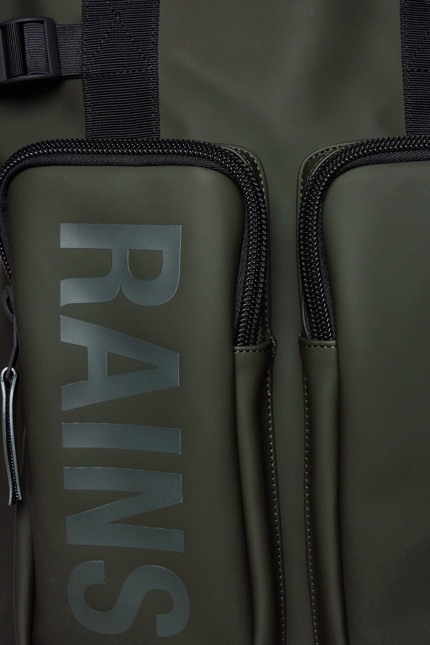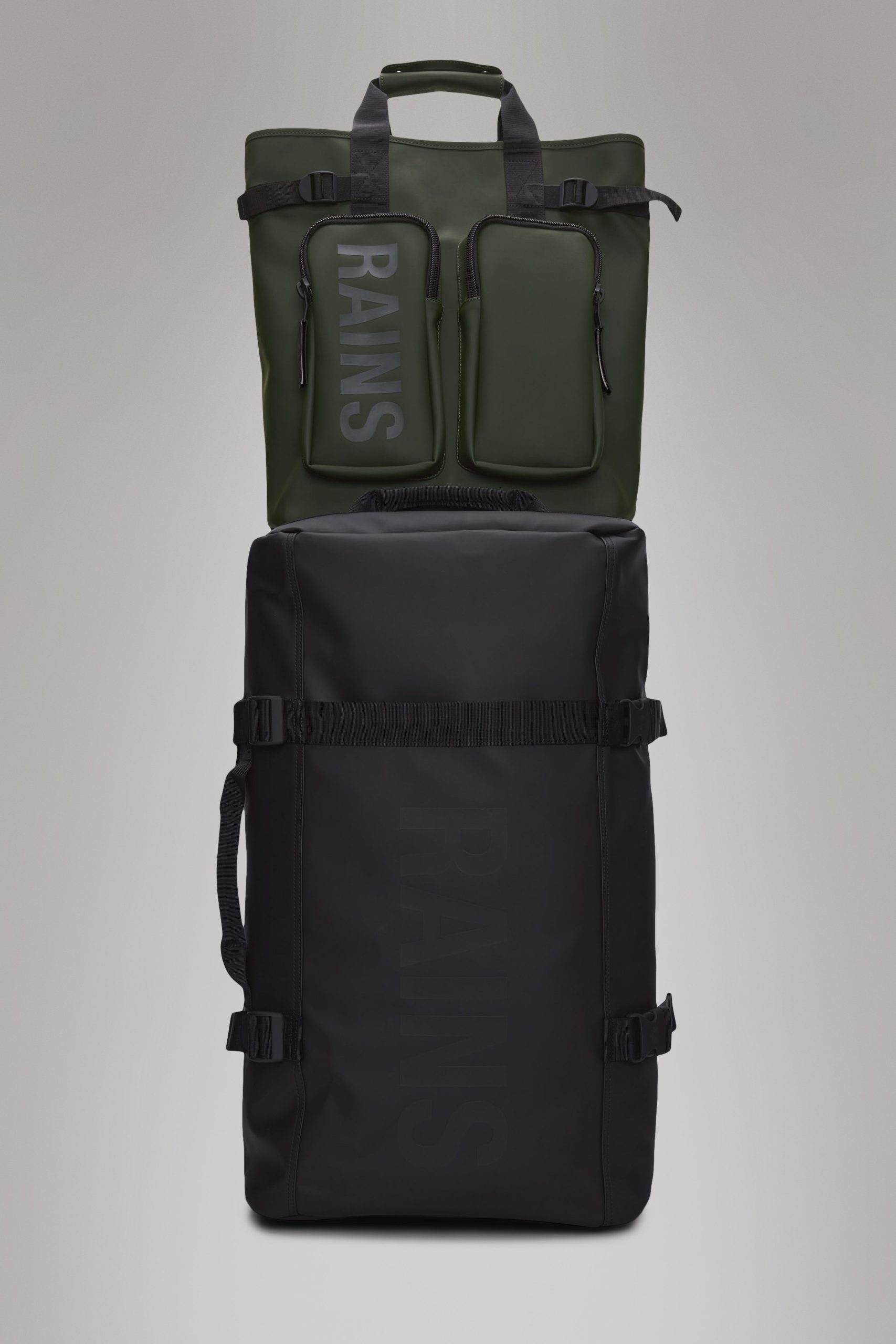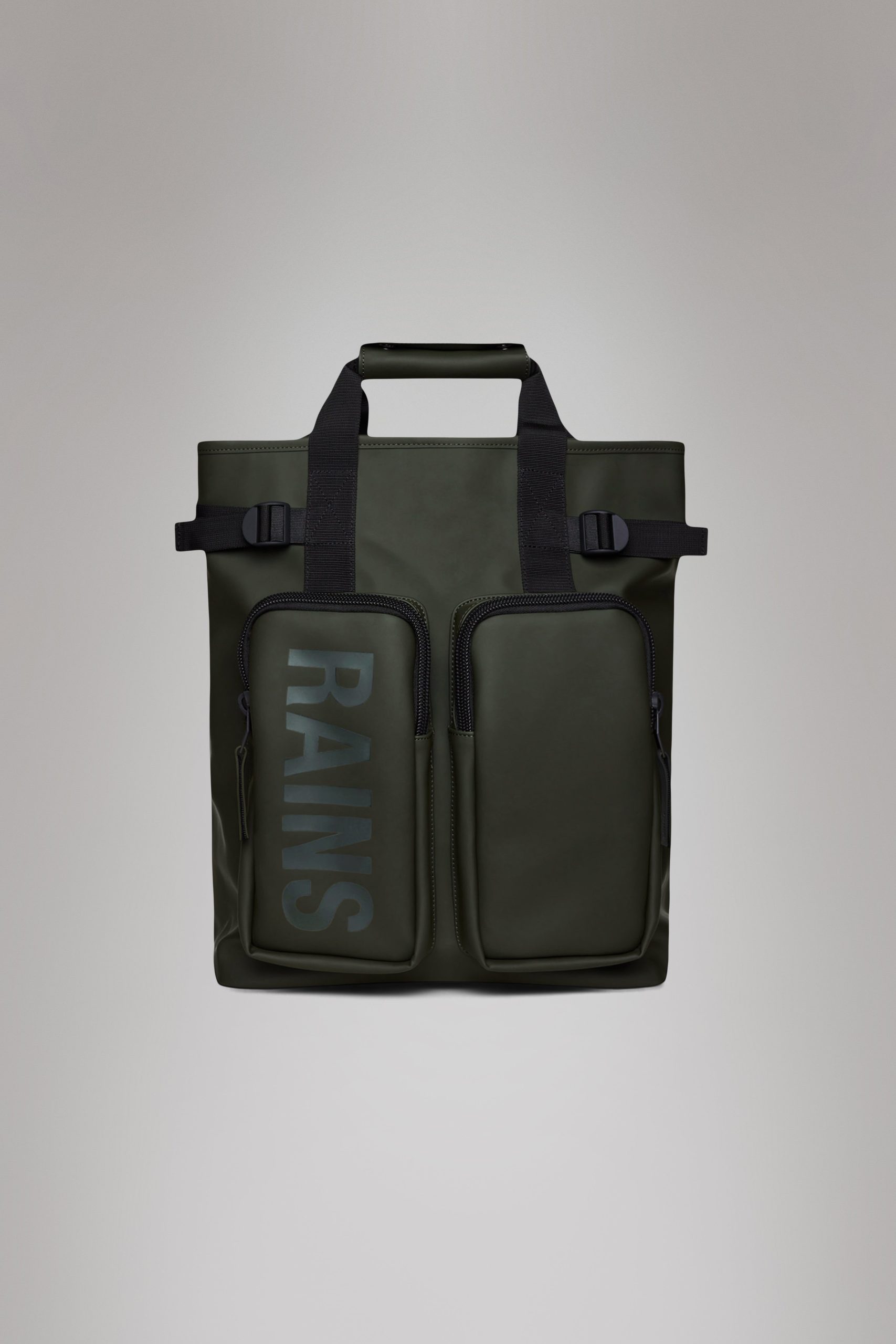 Texel Tote Backpack is a hybrid utility bag with a padded laptop sleeve designed for short travels. It is cut from waterproof PU fabric, designed to repel rain. Texel Tote Backpack doubles as a waterproof tote and backpack, worn via adjustable padded shoulder straps. Unzip the bag to reveal a spacious main compartment with mesh and zip pockets and a padded laptop sleeve for 15” laptops.On the outside, two front utility pockets are ideal for passports, chargers, and other small items. The design is finished with webbing carry handles and side compression straps. A back-mounted trolley sleeve, with zip pocket, allows the bag to be slid onto telescopic trolley handles for easy transportation.* Design is finished off with a padded mesh back panel for comfort. Texel Tote Backpack is cut from Rains’ signature waterproof PU fabric, engineered for carrying strength, durability, and a smooth feel.*Sized to fit Texel Cabin Trolley and Texel Cabin Bag. May not fit trolley bags from other manufacturers.