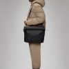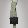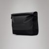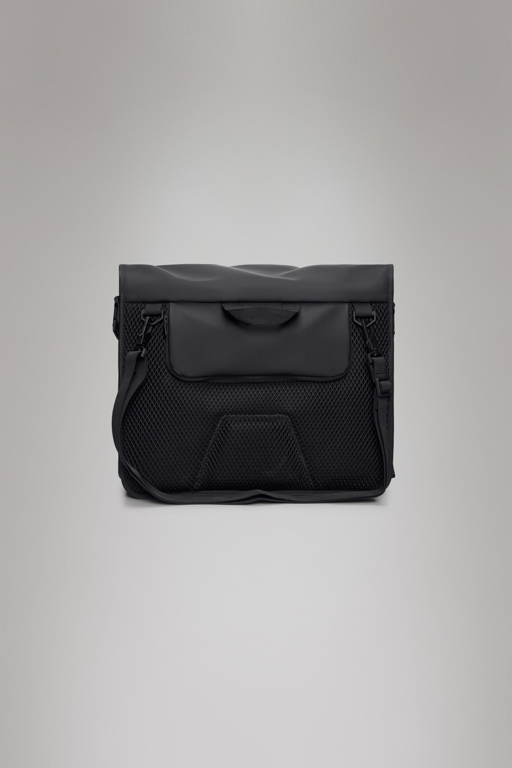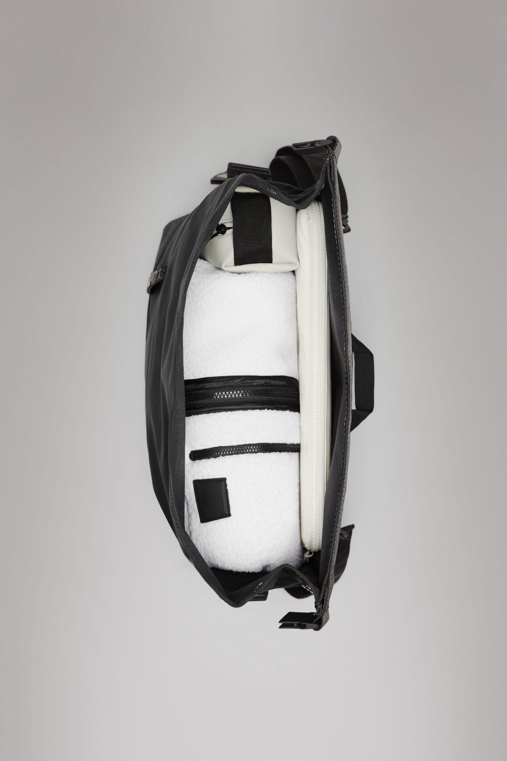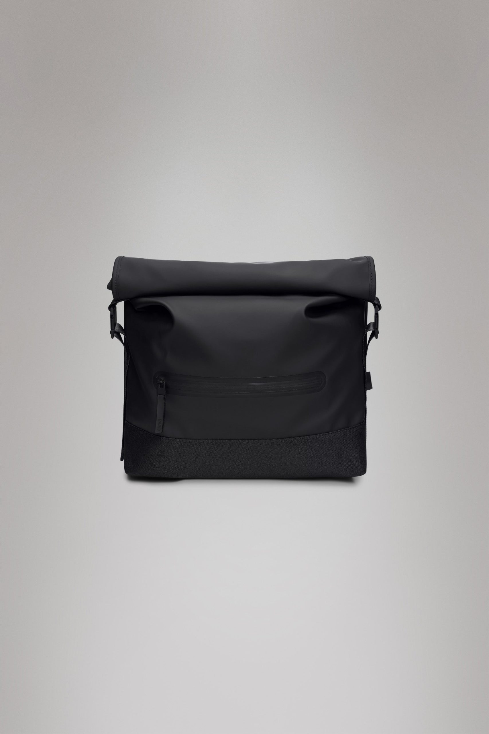 Trail Rolltop Messenger Bag is a compact commuter bag. A bike attachment transforms it into a ride-friendly pannier bag. Trail Rolltop Messenger Bag is the perfect bag for commutes in the city. Simply fold the rolltop opening to protect essentials from rain. Compress and tighten the bag further using the straps and buckle closures on the sides. This elevated rolltop version is fitted with the ‘Hook on System’* from cycle equipment experts BASIL, a patented attachment which transforms it into a ride-friendly pannier bag. When on the move by foot, carry the Trail Rolltop Messenger in the carry handle, on the shoulder or crossbody. Trail Rolltop Messenger Bag is cut from Rains’ signature PU fabric, engineered for carrying strength, durability and a smooth feel.*Hook on System Explainer: Unzip the backside pocket to reveal the ‘Hook on System’. Simply slide the 2 clip parts over one side of the fitted rear rack on the bicycle. Move the central lever 90 degrees to double secure the bag.