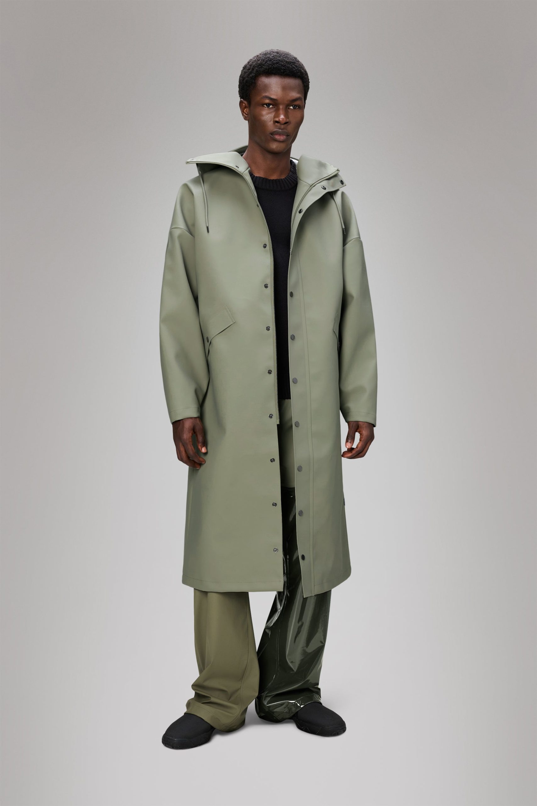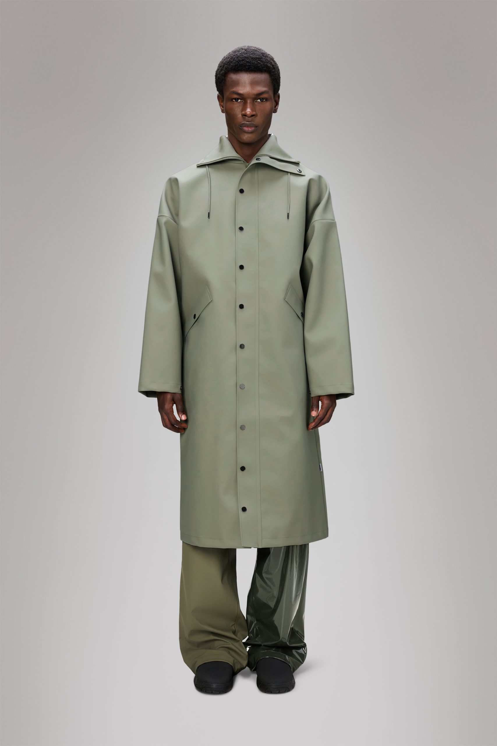 An oversized statement. Shown exclusively for FOREVER, our AW25 runway. Where the timeless balances with the extreme.The Vision Rain Jacket Long is a limited-edition unisex raincoat that mixes an oversized silhouette with exaggerated detailing. To enhance the shape, you’ll find dropped shoulders and an extra-large collar—which also acts as a wind defence when on-the-move.Crafted from a structured matte PU fabric, woven polyester and robust welded seams, expect high waterproof and windproof endurance, and excellent breathability—must-haves for every type of daily routine. The design is reinforced with welt pockets with snap closures, snap closures at cuffs, a tiecord hood, and CF zipper closure under placket with snaps—all keeping the rain out, while completing the clean aesthetic.